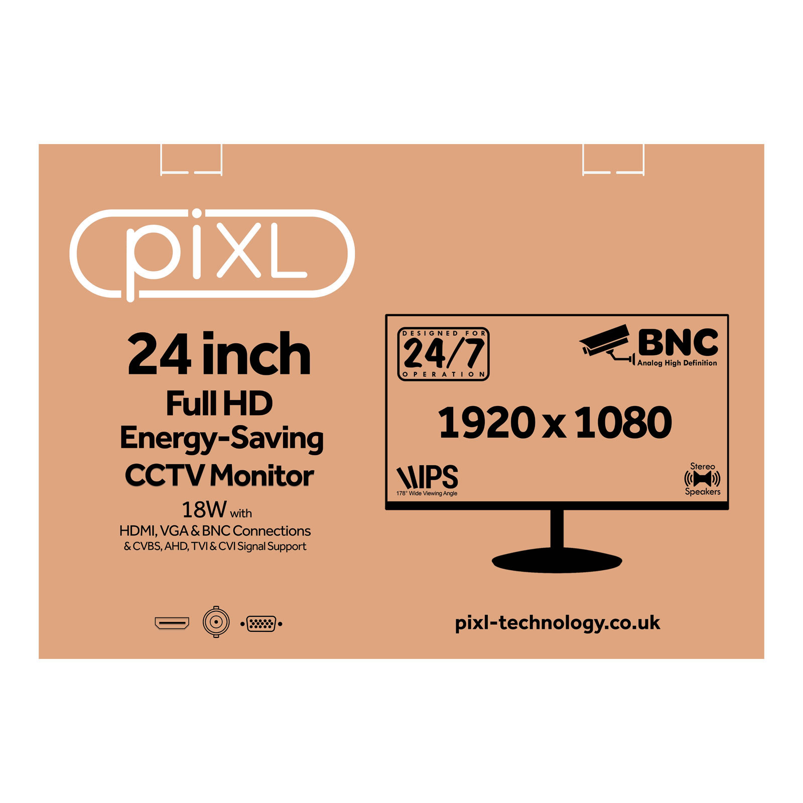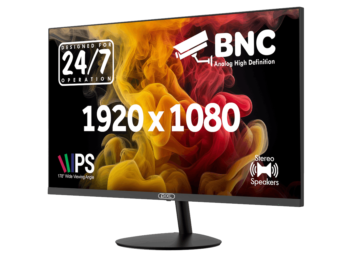 Experience crisp, reliable performance with the piXL 24-inch CCTV monitor - designed for both security and professional applications. Featuring a Full HD 1080p display, this monitor delivers sharp visuals and true-to-life colour accuracy, ensuring you never miss a detail. With versatile connectivity options including BNC, HDMI, and VGA, it easily integrates with CCTV systems, DVRs, and PCs alike.